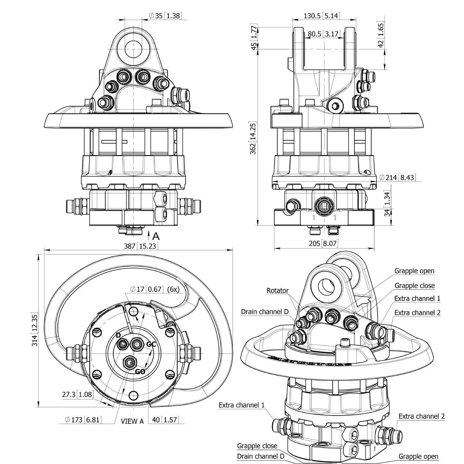 GRS stands for Grapple Rotator for Saw, solution with extra channels and Drain channel D.